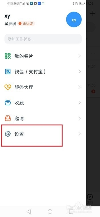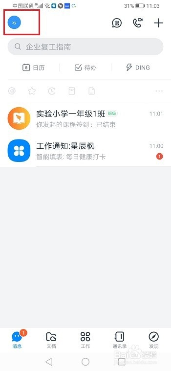 第二步打开钉钉,进去消息界面,点击账号头像,选择设置,如下图所示: