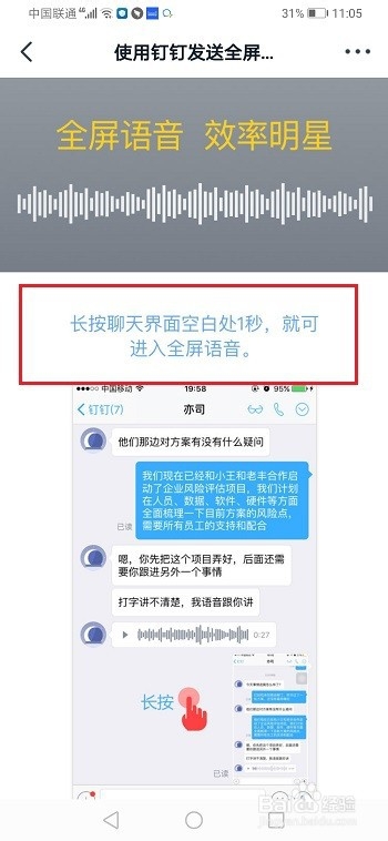 第一步钉钉全屏语音是可以更加快捷的进行发送语音,长按聊天空白处,可以进去全屏语音界面,进行发语音,如下图所示: