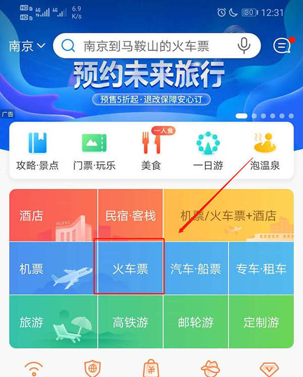 2、然后点击火车票,如图所示。