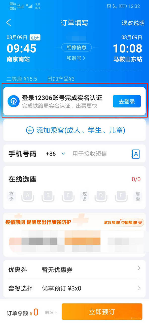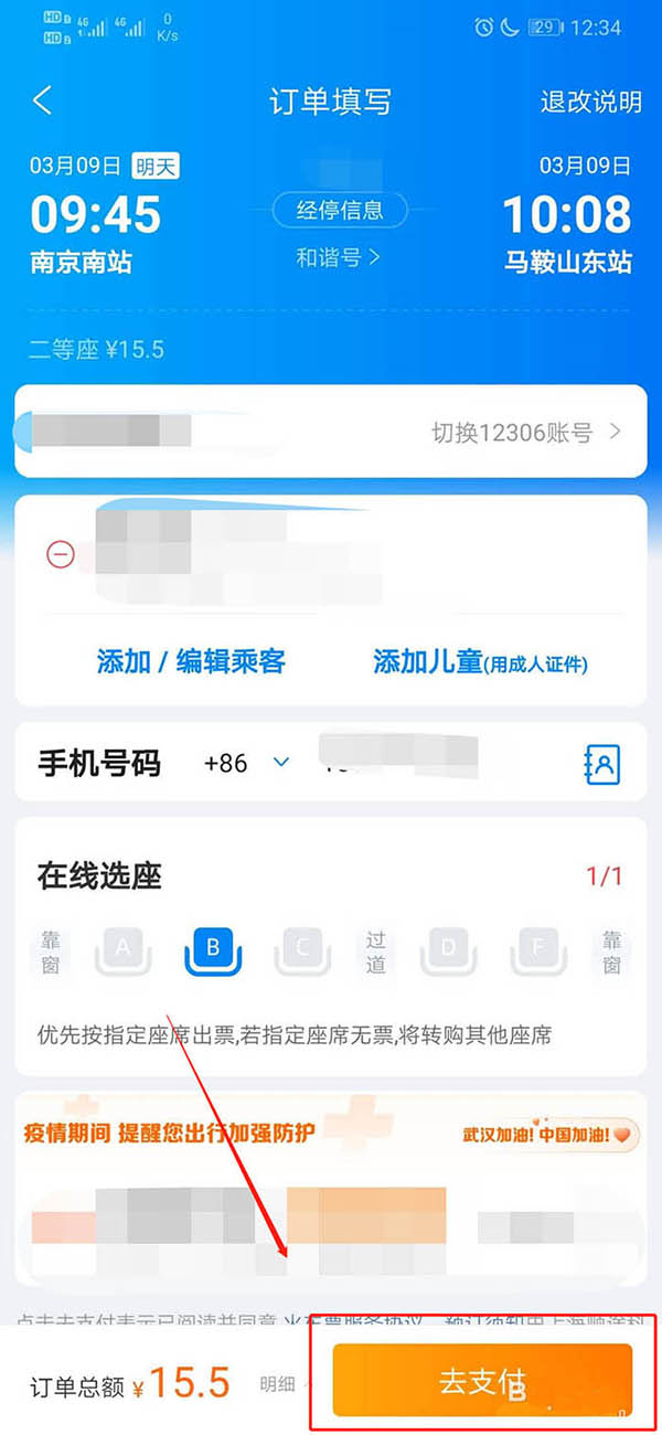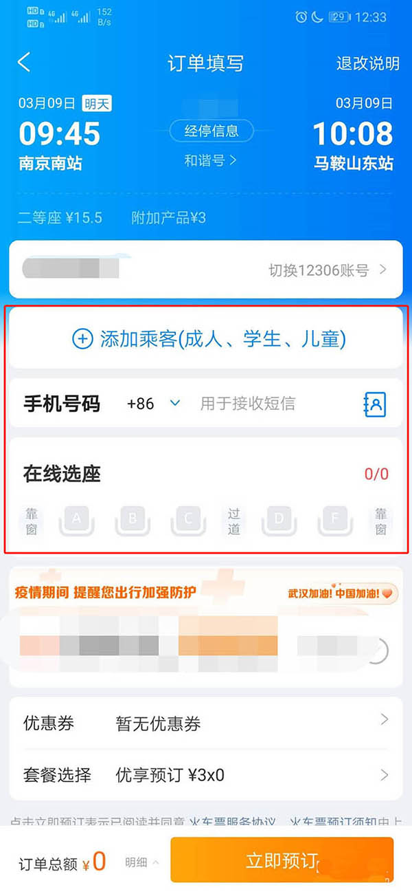 7、之后添加乘客,输入手机号,并选择座位,如图所示。