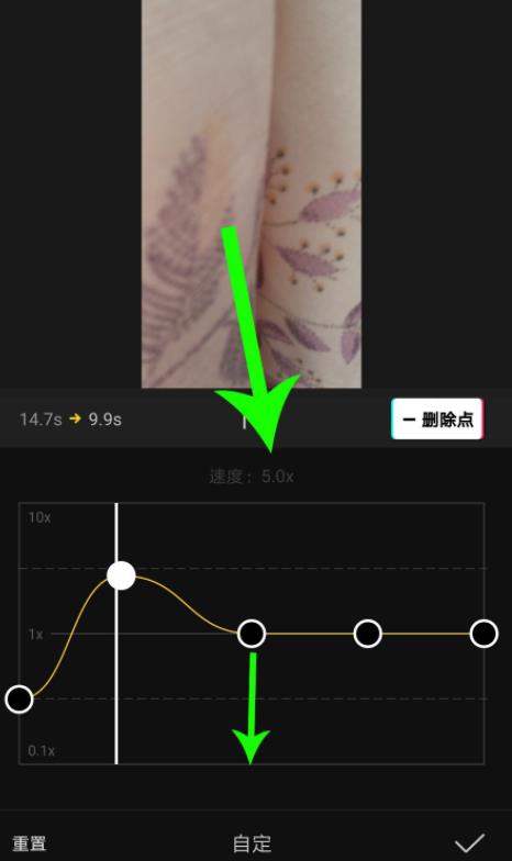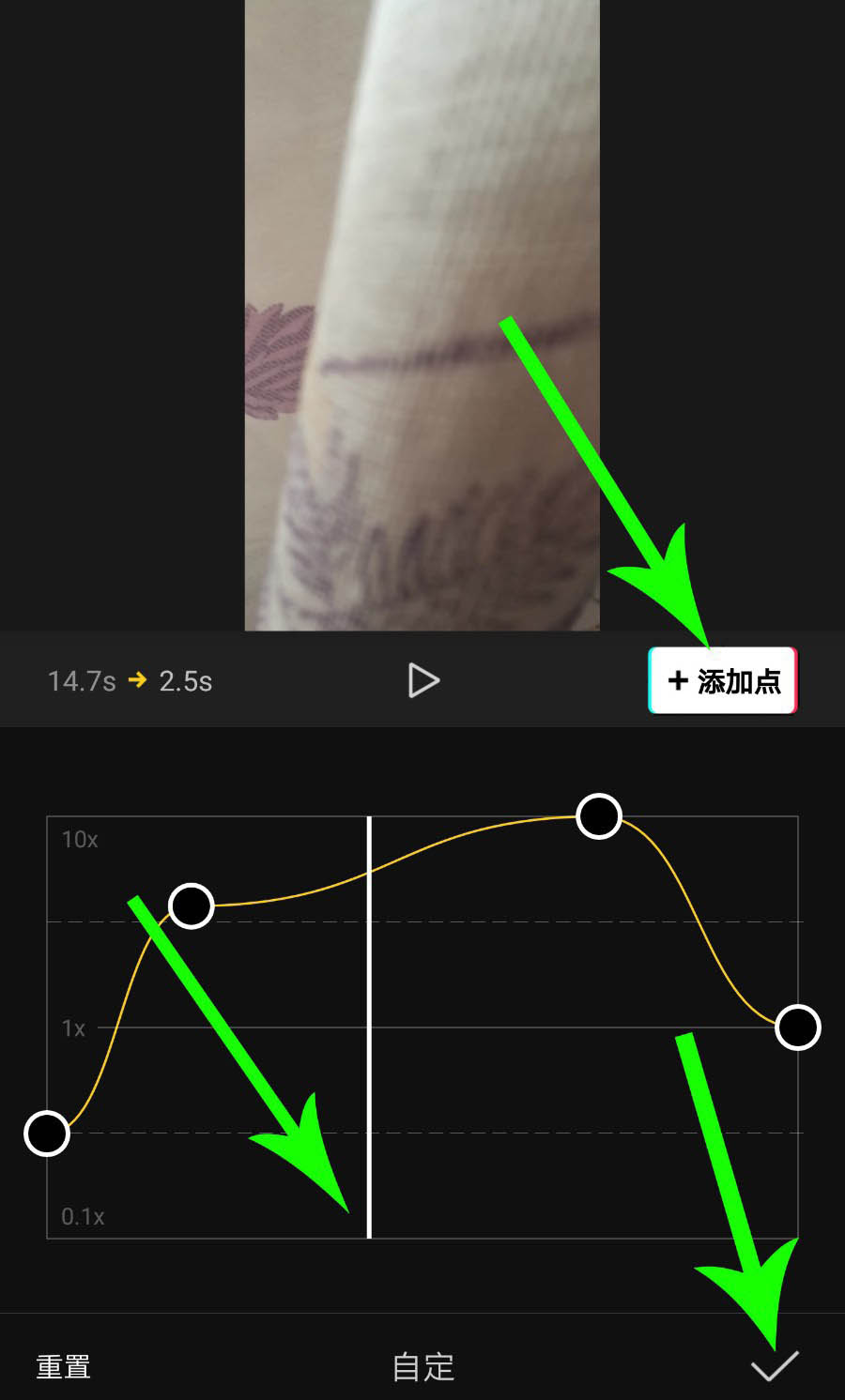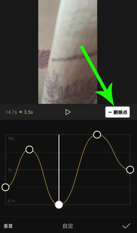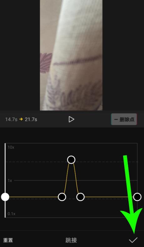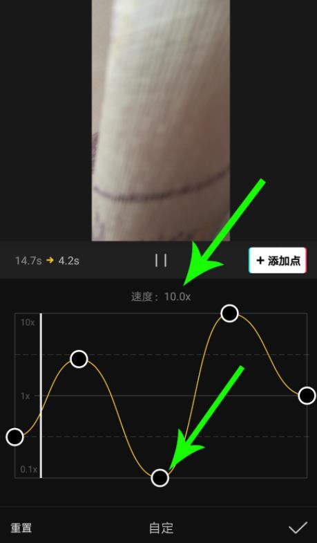 p>5、点击画面中的“+添加点”,可在白色时间线位置添加一个设置点,自定义曲线变速以后点击“√”提交保存设置即可。