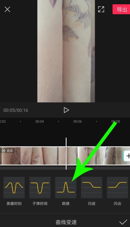 1、打开曲线变速界面向左滑动模板曲线,然后“跳接”模板,选中模板之后,整段视频素材播放速度将从0.5x线性增加至5.0x,然后线性减小至0.5x。