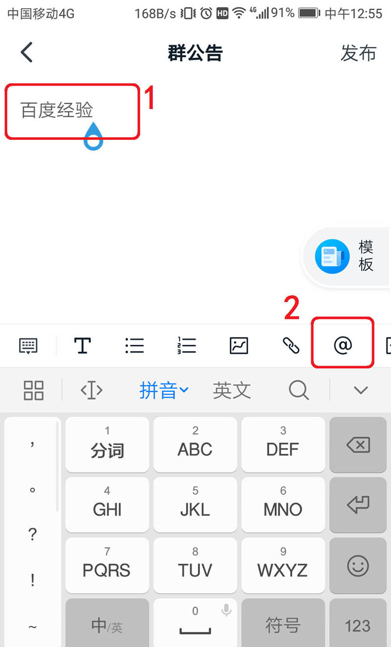 4、编辑好公告内容,再点击群公告下方的“@”,如下图: