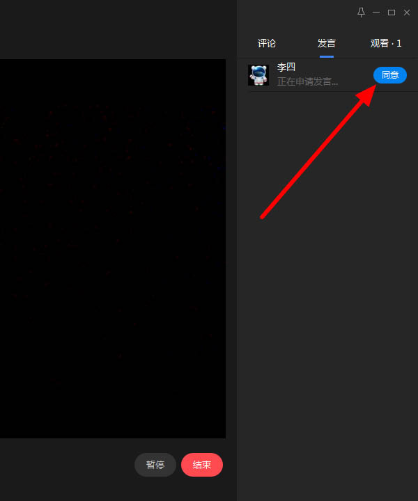 5、这时主播或者老师就会收到申请,在发言下就可以看到申请,点击“同意”;