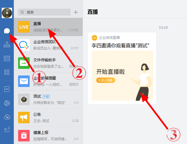 1、在电脑桌面打开企业微信,进入后,点击“消息”,接着点击直播邀请的消息,之后点击右边“进入观看”;