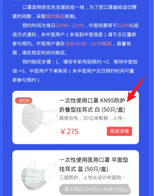 2,因口罩类物资优先支援抗疫一线,供应短缺,预约成功后,每人每天限购1盒,KN95防护级别的一次性使用口罩50只/盒,一次性使用医用口罩50只/盒,预约成功用户只能从两款中选购一盒;