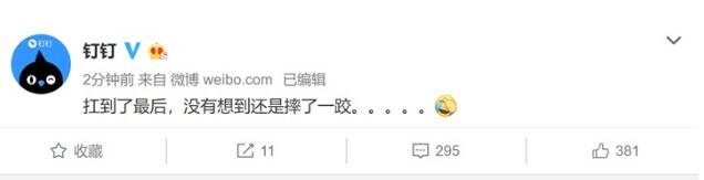 微博获悉,钉钉今天中午在微博回应,扛到了最后,没有想到还是摔了一跤。。。。。