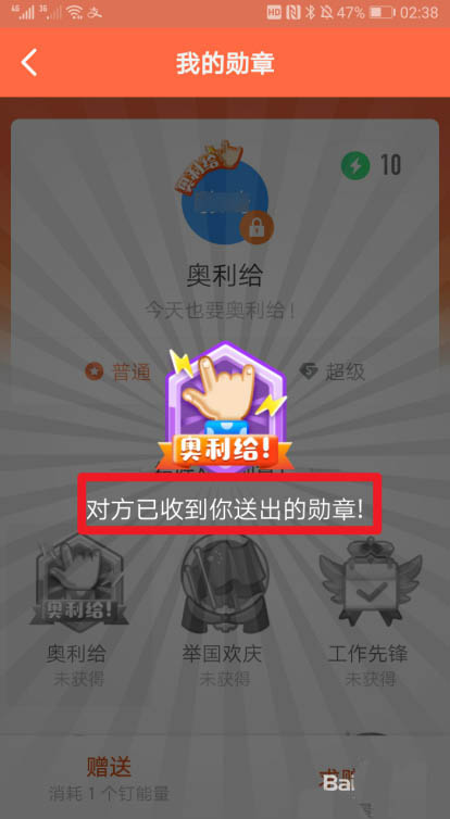 5、赠送给好友后会有系统提示,对方已收到你的礼物:【勋章】。