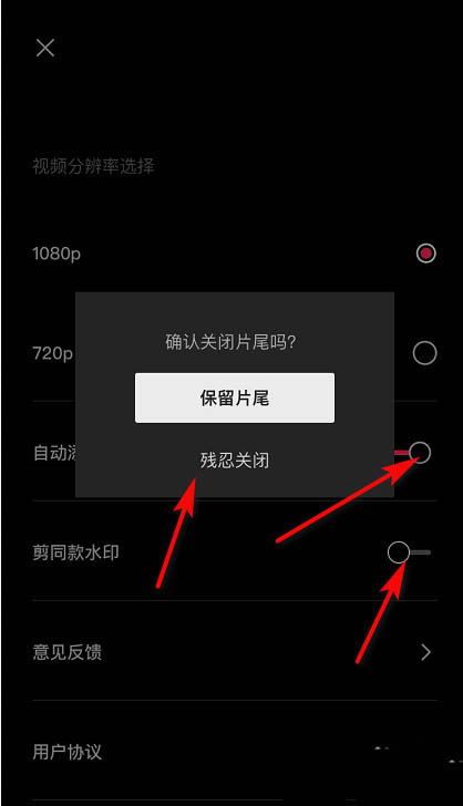 4、进入设置界面后,点击关闭-自动添加片尾以及关闭剪同款水印