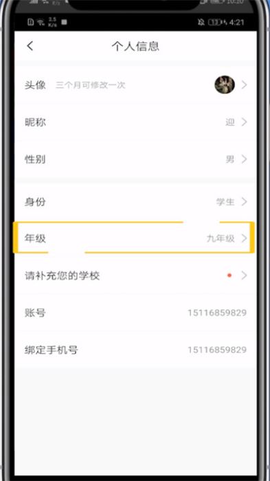 5、在个人信息页面可以看到“年级”选项,点击打开,然后选择好年级就可以更改了