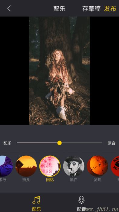 6、选好之后,直接点击该音乐样式进行添加即可,它会自动进行添加。如果你还要为该视频配音的话,可以点击“配乐”旁边的“配音”按钮,点击之后,会进入“配音”页面。