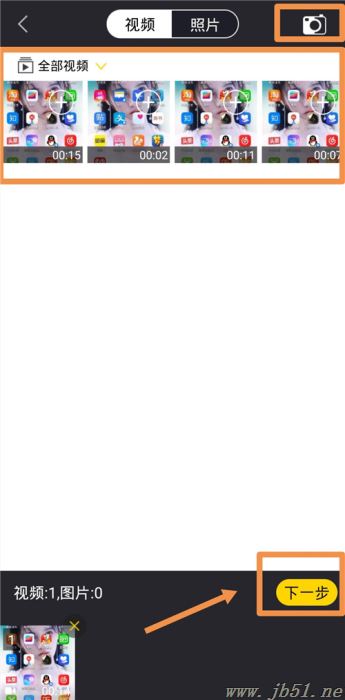 2、然后选择自己需要添加字幕的视频文件,将其导入到软件内,当然在界面上右上角有一个“拍摄”选项,你可以现拍现编辑,在视频成功导入后,我们点击“下一步”选项。