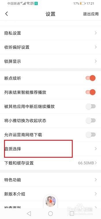第三步进去喜马拉雅设置之后,点击音质选择,如下图所示: