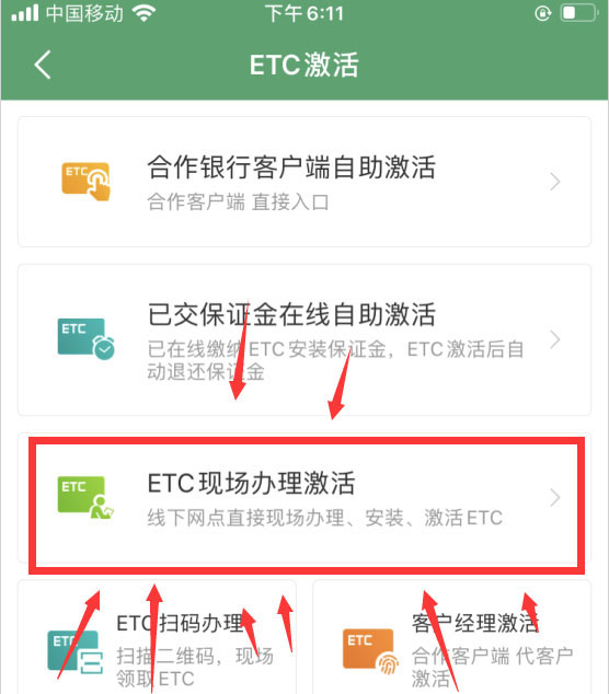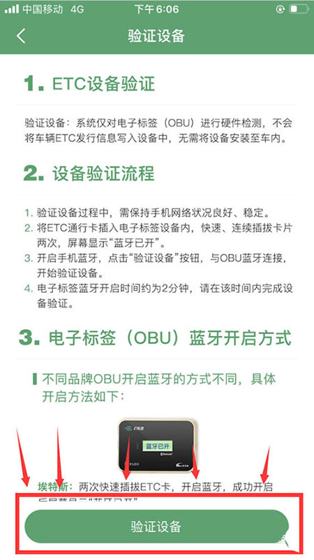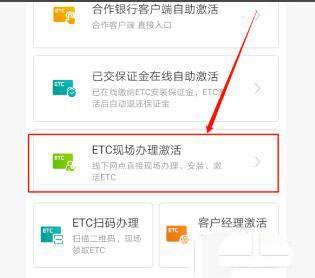 3、随后选择“ETC现场办理激活”,根据提示,打开手机蓝牙、OBU设备蓝牙,在点击“验证设备”。