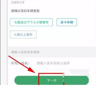 4、验证后选择办理银行,在银行中选择“农商银行”,填写车辆信息及车主信息,在点击“下一步”。