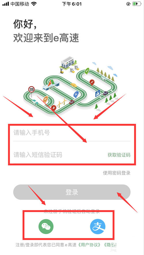 1、首先车主持身份证、行驶证、银行卡开车到就近银行网点,下载“e高速”App,打开后输入手机号获取验证码登录,或通过微信、支付宝登录都可以。