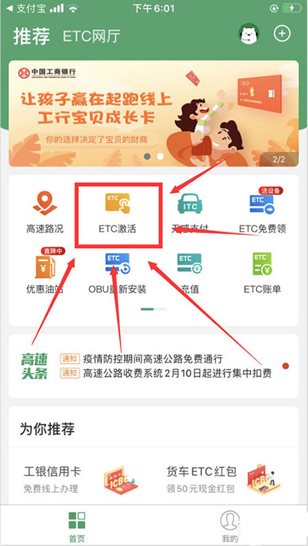 2、然后确定打开定位的开关,我们在点击“首页”的“ETC激活”选项,如下图所示。