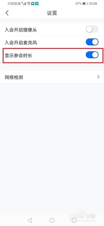 第三步进去设置界面,点击开启显示参会时长,如下图所示: