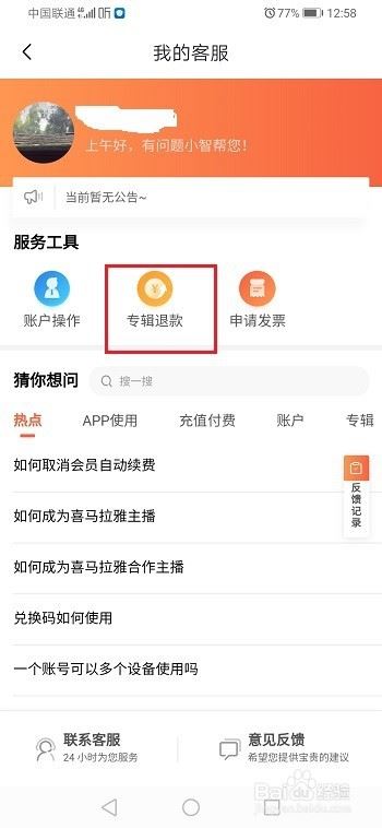 第三步进去联系客服界面之后,点击专辑退款,如下图所示:
