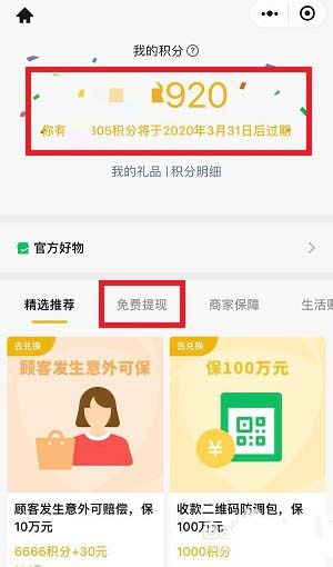 4、即可看到我们的微信收款积分,(积分下方会提醒我们有多少积分在什么时间会过期),点击下方【免费提现】。