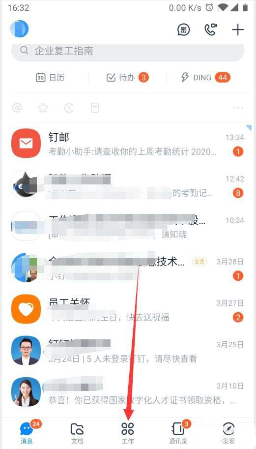 1、打开手机钉钉,然后在树叶中找到如图所示的最下方的工作的功能按钮。