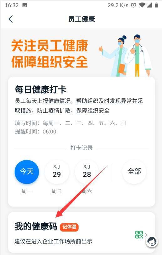 3、进入员工健康后,在员工健康中找到下方的我的健康码的功能。