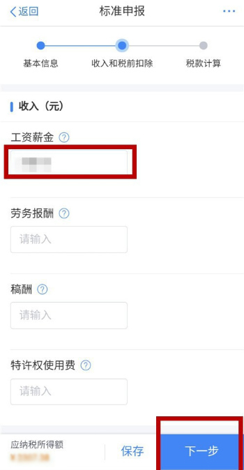 4.进入收入和税前扣除页面,填写收入数据,包括了工资薪金、劳务报酬、稿酬以及特许权使用费等信息,点击【下一步】。再填写专项扣除信息,包括:基本养老保养、基本医疗保险、失业保险、住房公积金等。应缴税所得额代表了你有多少收入需要缴税。