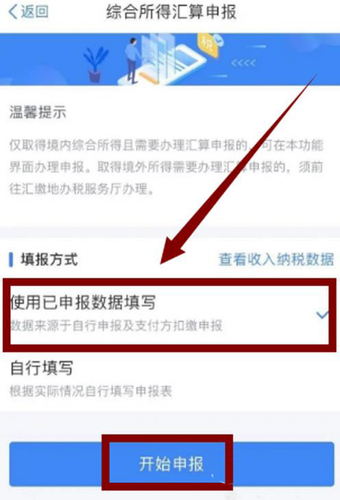 3、综合所得年度汇算申报,选择”选用已申报数据填写“。