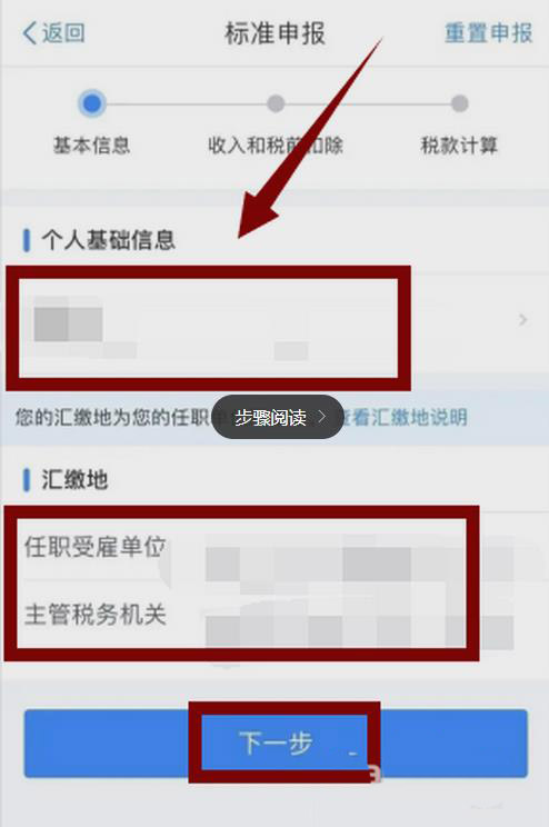 5、标准申报,核对个人基础信息和选择汇缴地。