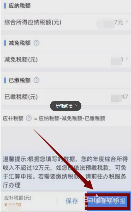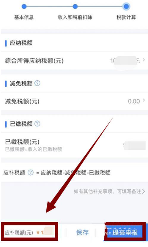 6、税款计算,显示需要”应补税额“,如果是小于400元,可点击”享受免申报“。大于400元,需要进行补缴,点击”提交申报“。