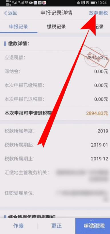 4、进入申报记录详情,点击放弃退税。
