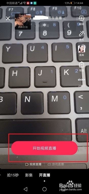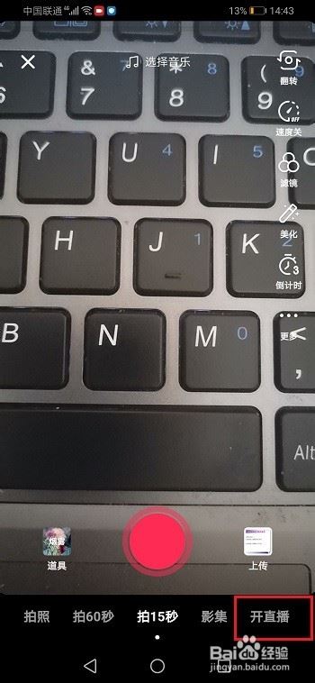 第一步手机上打开抖音,进去拍视频之后,点击底部的开直播,如下图所示: