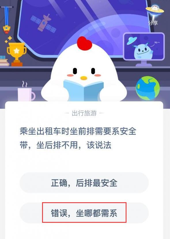 以上便是脚本之家小编为大家分享的"乘坐出租车时坐前排需要系安全带坐后排不用?支付宝蚂蚁庄园4月7日答案"的全部内容,希望能够帮到你,脚本之家持续发布更多资讯,欢迎大家的关注。