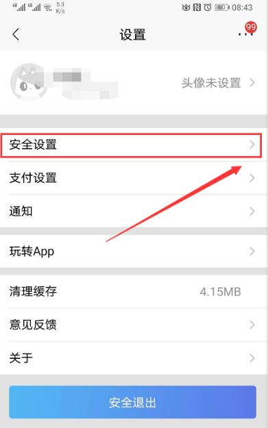 4、进入到设置详细页面后,选择【安全设置】选项,点击右侧的小箭头进入到详细设置页面。