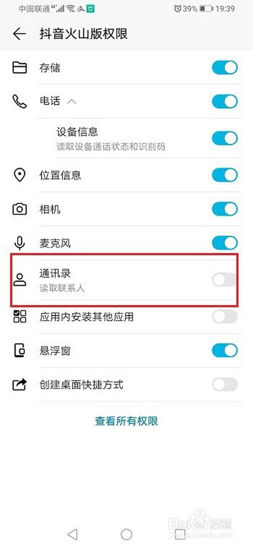 第五步在抖音火山版权限设置界面,点击关闭通讯录权限就完成了,如下图所示: