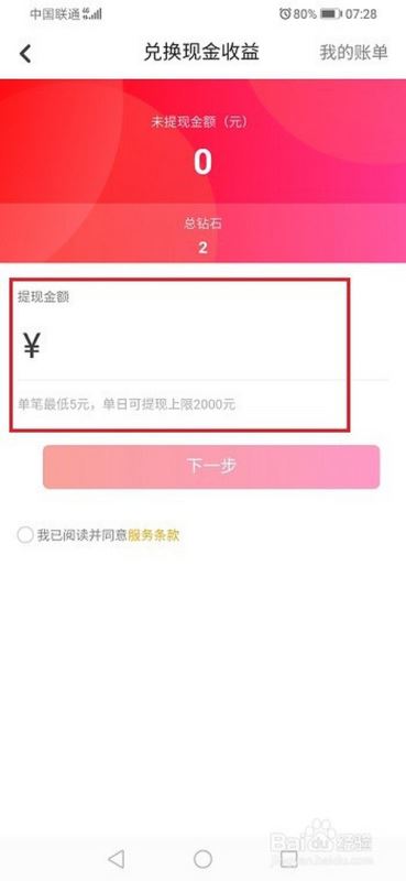第四步进去兑换现金收益界面,输入提现金额,进行提现就完成了,如下图所示: