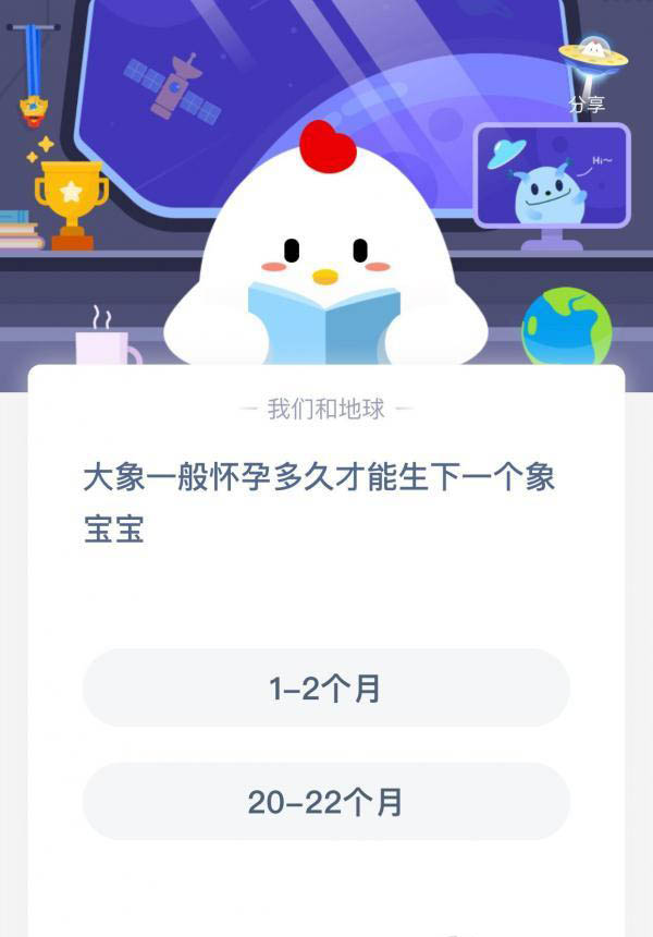 小鸡宝宝考考你,大象一般怀孕多久才能生下一个象宝宝?相信很多玩家都不知道这个答案,答对就可以领取到180g小鸡饲料。今天,小编为大家带来了蚂蚁庄园5月6日正确答案,感兴趣的朋友快来了解一下吧。