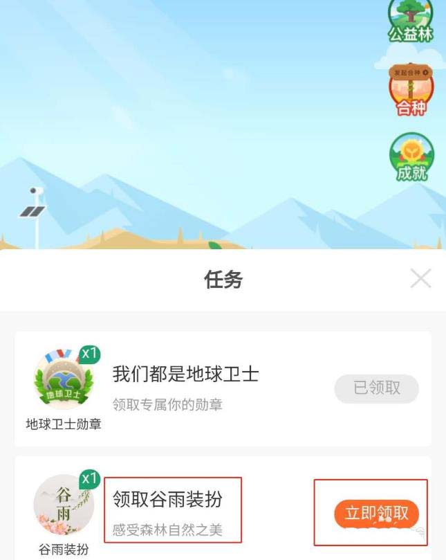 打开支付宝进入蚂蚁森林应用,点击蚂蚁森林节目中的任务选项,选择相对应的“领取谷雨装扮”--“立即领取”,就可以获得对应的装扮,装扮大树了。
