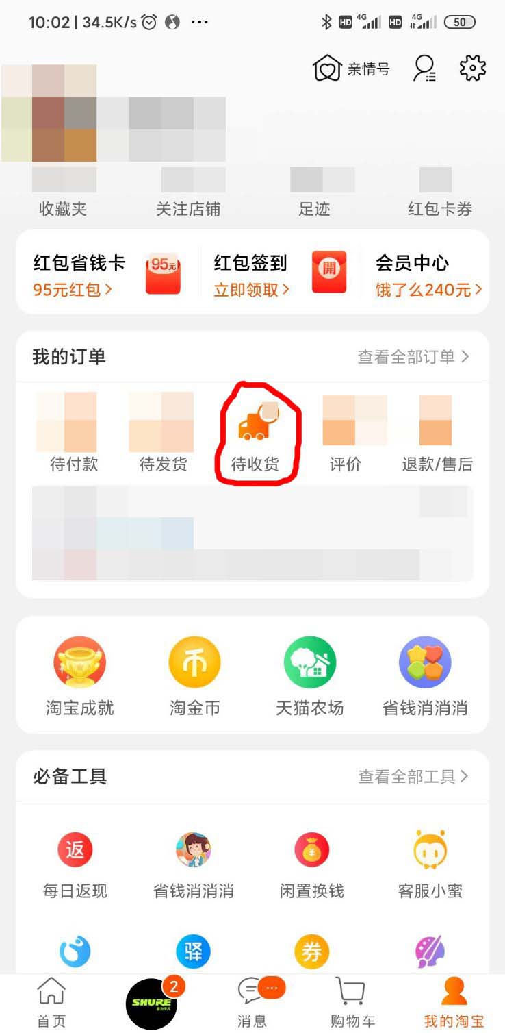 2、在“我的淘宝”中找到“我的订单”,选择“待收货”。