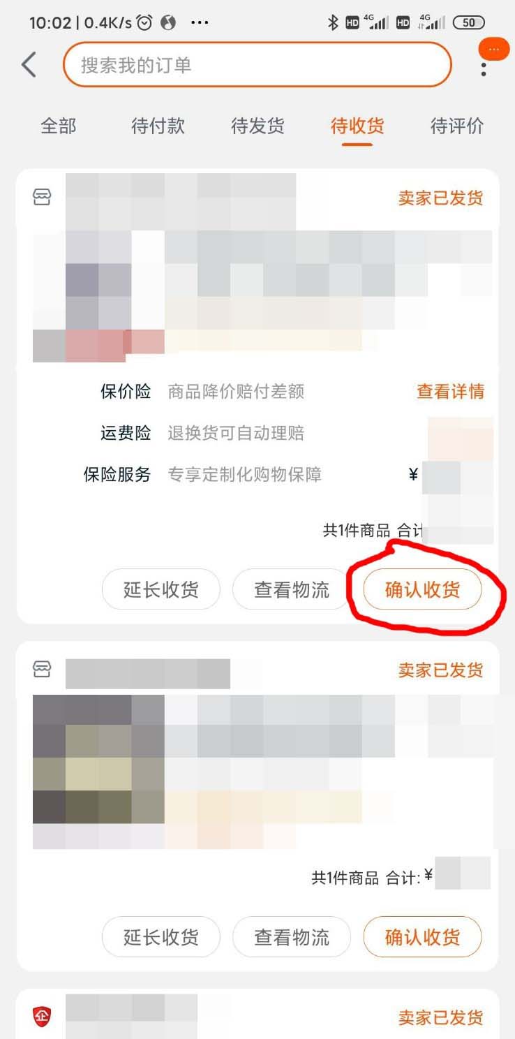 3、在待收货列表中,找到已经收到的商品,点击确认收货。