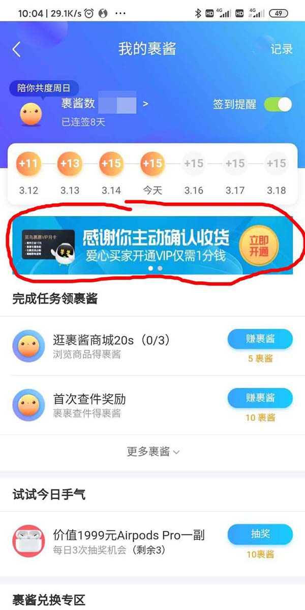 7、在我的裹酱界面可以看到有1分钱开通 VIP惠东活动。