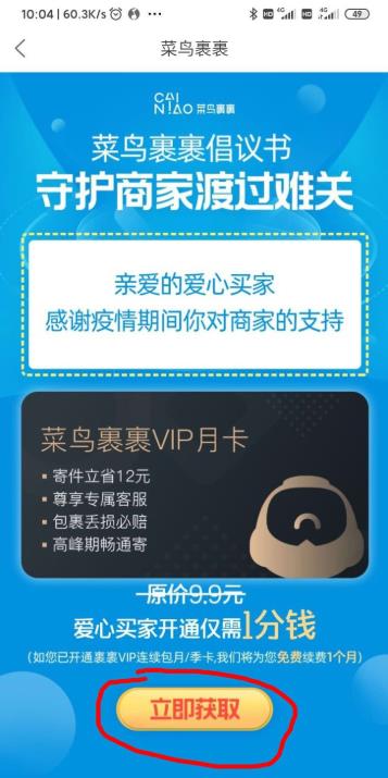 8、点击活动链接,点击立即获取,即可出来支付页面。立即支付0.01元,即可获得1个月的菜鸟裹裹会员了。