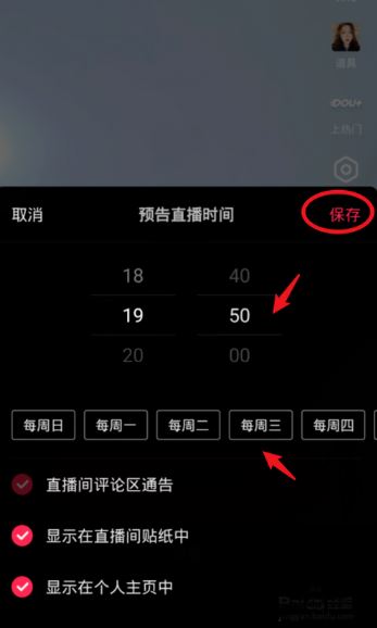 在设置界面,选择直播的时间以及预告展示的方式,点击保存。