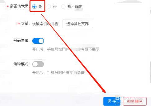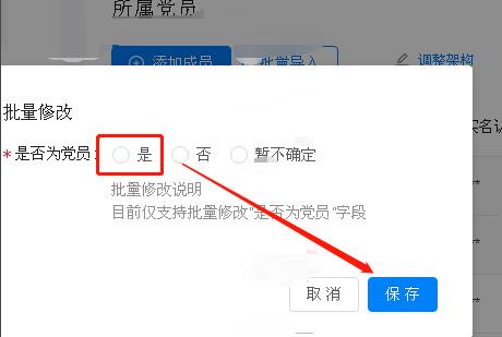 5、在弹出的菜单中按照是否党员选择是或者否,然后保存。