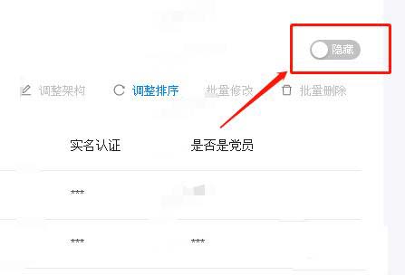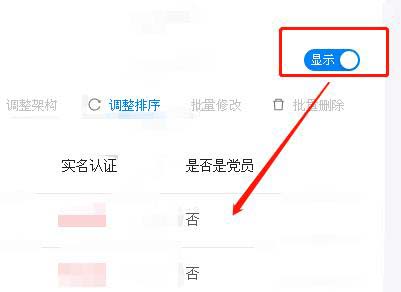 7、若要查看信息,可在所属党员页面,将右侧的“隐藏”点为“显示”即可。