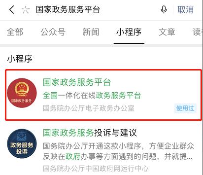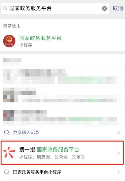 2、在搜索框中输入“国家政务服务平台”,在搜索结果中点击选择“搜一搜 国家政务服务平台”。