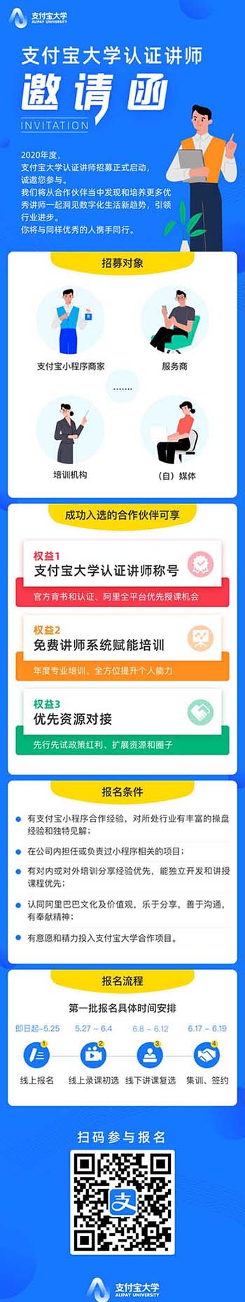 支付宝大学开始招募讲师啦!,还是官方认证的那种哦,不限学历、不限专业,我们诚邀每一个有经验、爱教学的你,不论你是支付宝商家服务商,还是专业的培训老师,抑或是自媒体达人,在这里,你可以面向支付宝的众多合作伙伴,分享你的数字化经验、沟通最新想法,该怎么申请成为讲师呢?下面我们就来看看详细的教程。