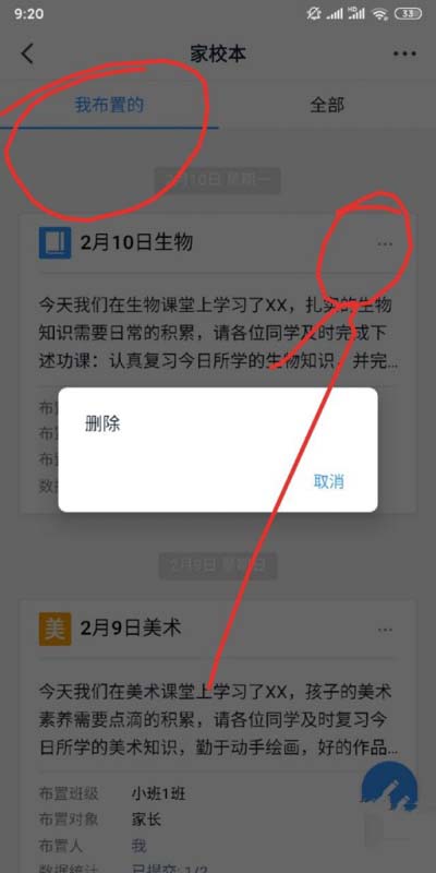 3、找到要删除的作业,点击右上角三个点图标,在跳出来的对话框中点击“删除”。