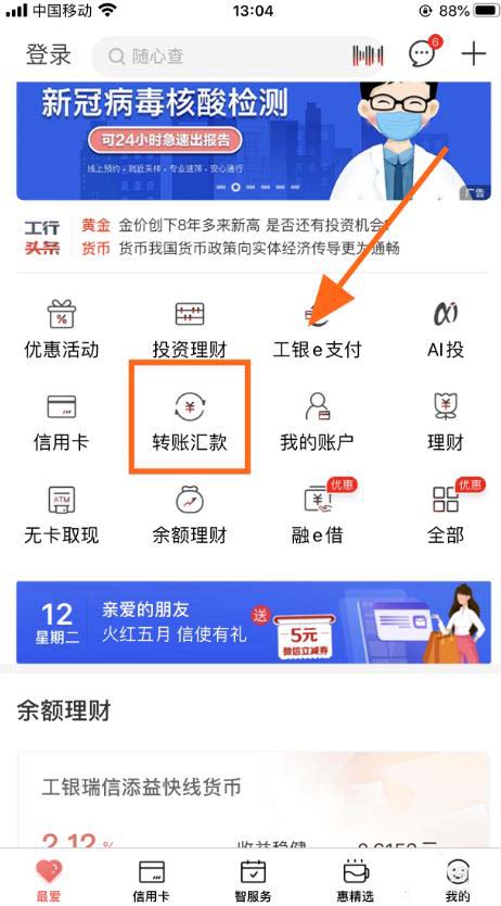 2、登录账号,点击【转账汇款】功能;