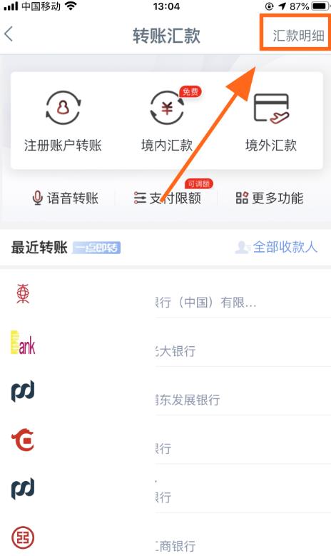 3、进入转账汇款,点击右上角的【汇款明细】;